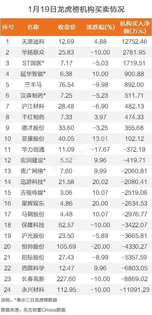 机构参与龙虎榜中个股共涉及24股,其中10股被机构净买入,天源迪科被买入最多,为1.28亿元。另外14股被机构净卖出,永兴材料被卖出最多,为1.11亿元。