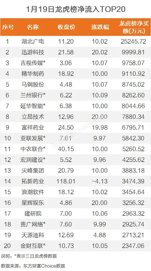 1月19日,上榜龙虎榜个股中,资金净流入最多的是湖北广电,为2.52亿元。数据显示,该股日内涨停收盘,全天换手率25.87%,成交额27.75亿元。资金净流入居前的东方证券上海源深路净买入1.09亿元。
