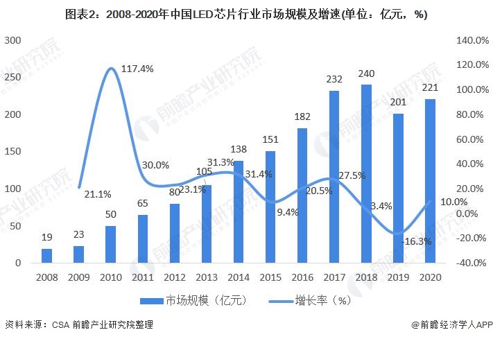 总的来看,LED芯片行业发展整体呈现较为明显的周期性波动。从2008年到现在,我国LED 芯片行业总共经历了四轮周期性变化,每一轮周期性变化都呈现出“技术突破/应用扩展—企业扩产/价格上涨—产能过剩/价格下降”的发展趋势。在经历了2019年LED芯片行业产能过剩、价格下跌之后,2020年LED芯片行业迎来增长,受益于终端需求增长以及Mini LED技术推动,LED芯片行业迎来新一轮增长周期。根据CSA数据显示,2020年我国LED芯片行业市场规模达到221亿元,较2019年增长10.0%。