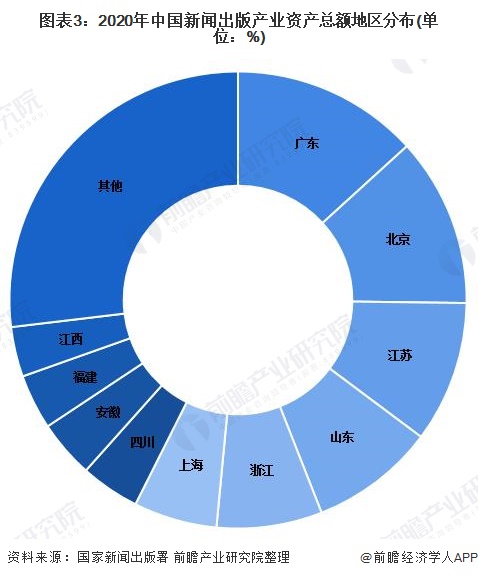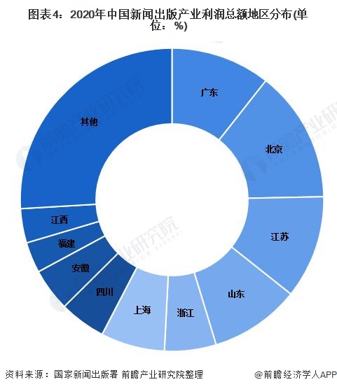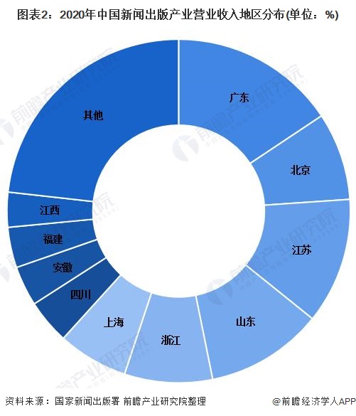 国家新闻出版署对全国3l个省(自治区、直辖市)及新疆生产建设兵团2020年新闻出版业的总体经济规模进行综合评价,广东、北京、江苏、山东、浙江、上海、四川、安徽、福建和江西依次位居全国前10位。其中,前6位均属于东部地区,东部地区新闻出版产业规模优势明显。