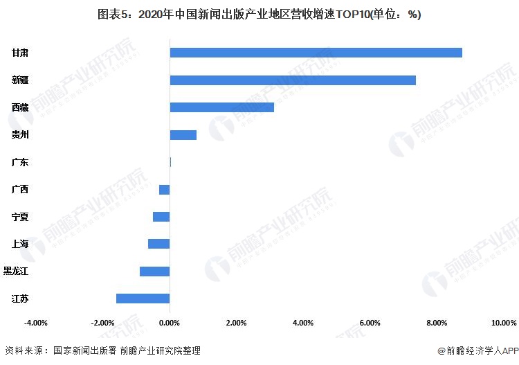 近年来,中西部地区增长态势较好,2020年各地区新闻出版行业营业收入增速排名中,甘肃、新疆、西藏、贵州和广东的营收增速位居前五,在营收增速前10的地区中,东部地区占据3席,东北地区占1席,西部地区占据6席。同时,由于行业整体营收规模的下降,2020在收入前十的地区中,有五个地区收入呈现负增长。