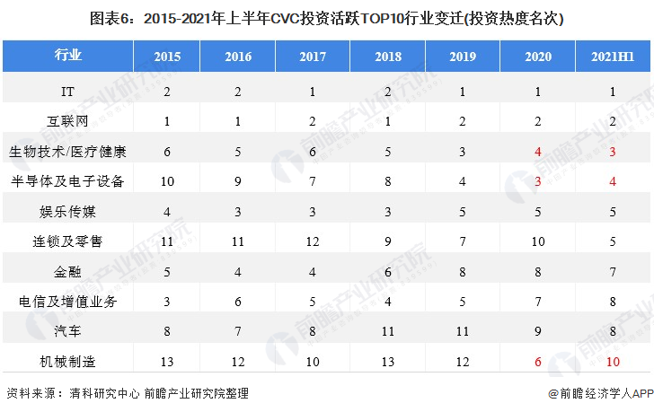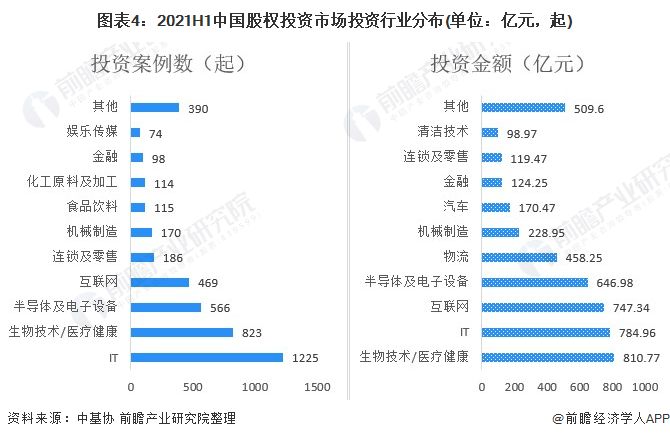 2021年上半年,从投资案例数量来看,IT、生物科技/医疗健康、半导体及电子设备投资案例数分别以1225起、823起和566起排行前三,投资金额来看,生物技术/医疗健康、IT、互联网分别以810.77亿元、784.96亿元和747.34亿元排行前三。