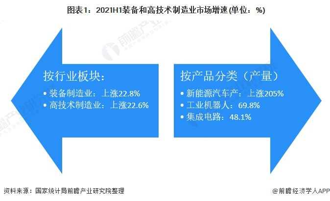 2021年上半年,随着我国经济的逐渐复苏,制造业增速领跑其他行业,尤其是传统采矿、电力、热力、燃气和水生产供应业,其中装备和高技术制造业引领作用凸显,其中产品方面,新能源汽车、供应额机器人和半导体集成电路增速尤其明显,远超行业其他品类。