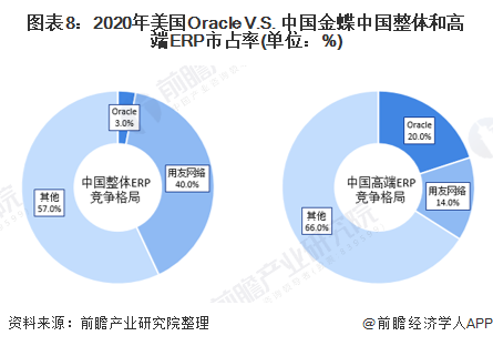 在中国ERP软件整体市占率方面,2020年,用友网络的市占率排名第一,为40%,Oracle的市占率排名第五,为3%。在中国高端ERP软件市占率方面,2020年,Oracle的市占率排名第二,为20%,用友网络的市占率排名第三,为14%,。