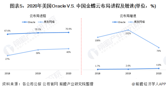 从云化进程来看,2018-2020年,Oracle的云化进程始终高于用友网络。2020年,Oracle的云化进程达到了70.9%,而用友网络用友网络的云化为40%。