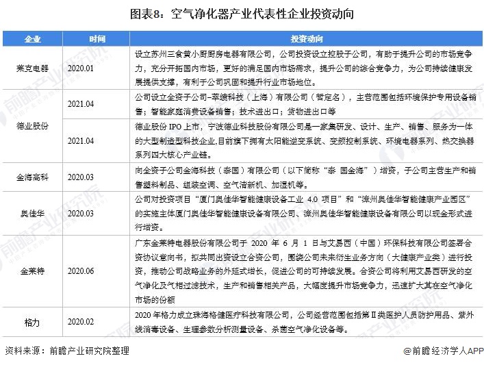 2020年以来,空器净化器产业代表性企业的投资动向主要包括成立子公司、对子公司增资。空气净化器产业代表性企业最新投资动向如下: