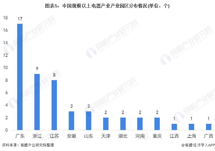 目前,我国空气净化器所处的电器行业产业园区共有52个,主要分布在广东省、浙江省和江苏省,其中广东产业园区最多共有17个。