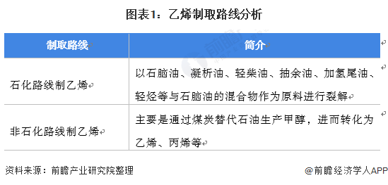 乙烯工业是石油化工产业的核心,我国是世界仅次于美国的第二大乙烯生产国。中国乙烯工业主要以石脑油为原料,一些原料短缺的企业,还会使用凝析油、轻柴油、抽余油、加氢尾油、轻烃等与石脑油的混合物作为原料进行裂解,但总体来说,这些原料主要源自石油,属于石化路线制乙烯。非石油化工的替代工艺主要是通过煤炭替代石油生产甲醇,进而转化为乙烯、丙烯等。