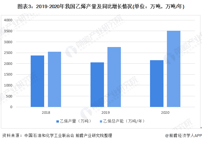 根据中国石油和化学工业联合会2021年发布的公告,2020年我国乙烯新增产能755万吨,至3518万吨;乙烯产量2160万吨,预计未来新增产能步伐进一步加快。