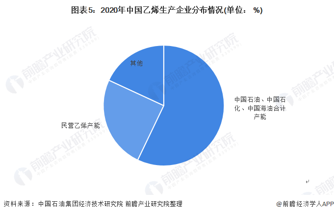 中国乙烯行业产能主要来自国有企业。根据中国石油集团经济技术研究院数据,2020年,中国石油、中国石化、中国海油等国有企业合计产能占比则从上年的74.9%降至57.1%;民营乙烯产能达873.5万吨/年,占比升至24.8%,同比提高2.4个百分点。