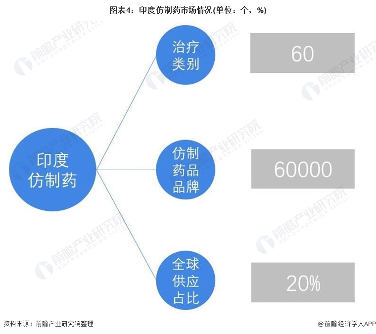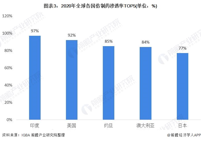 仿制药作为印度制药业中最重要的部分,被誉为“世界药房”,随着其仿制药行业的不断发展,已经成为全球仿制药行业的主要贡献者之一。据国际政府基准测试协会(IGBA)数据显示,全球仿制药渗透率前5名的国家中,印度以97%的渗透率排名第一。目前印度拥有60个治疗类别的60000个仿制药品牌,是全球最大的仿制药供应商,占全球供应量的20%。在全球Top15仿制药企业中,就有七家企业属于印度。