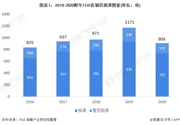 全球仿制药行业发展历史悠久,起源于1983年FDA通过的Waxman法案,法案允许仿制药企业在相关专利期满之前,在没有提交专利侵权声明之前,就可以提交申请和开展生物等效试验。此后,全球仿制药市场开始蓬勃发展。根据数据显示,近年来全球仿制药获批数量不断增长,2020年疫情影响有所下降,美国食品和药物管理局(FDA)共批准909项仿制药,其中737项为完全批准,172项为临时批准;此外,全球仿制药市场规模也在不断增长,2020全球仿制药市场规模在4520亿美元左右。