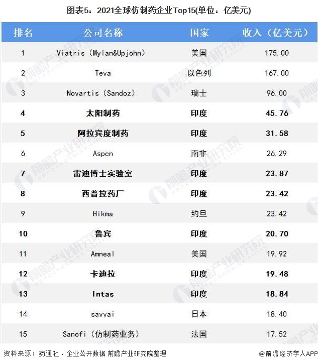 全球仿制药行业主要上市公司:目前全球仿制药行业主要上市公司有Viatris(NASDAQ:VTRS)、Teva(TLV: TEVA)、Novartis(SWX: NOVN)、太阳制药(NSE: SUNPHARMA)、Aspen(NASDAQ: ASPU)、Hikma(LON: HIK)、Amneal(NYSE: AMRX)、卡迪拉(NSE: CADILAHC)、Sanofi(EPA: SAN)等。