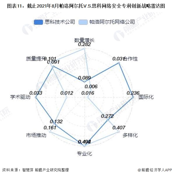 整体来看,思科与帕洛阿尔托的网络安全技术在专业化上并驾齐驱;帕洛阿尔托在多样化、市场推动、质量提升、数量增长方面略胜一筹;思科在国际化、合作性、学术驱动方面有所优势。