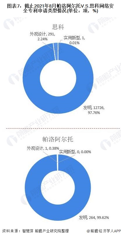 思科和帕洛阿尔托专利申请类型以发明专利为主,帕洛阿尔托基本为发明专利。思科除发明专利占比为97.76%之外,外观设计专利亦有291项,占比2.24%,实用新型数量为1,占比0.01%。