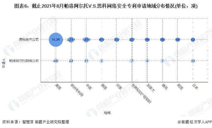 目前,思科和帕洛阿尔托的网络安全专利申请区域主要集中在美国,两者在美国申请的相关专利数量分别为15331项和442项。欧洲是两者网络安全准李申请的第二大地区。