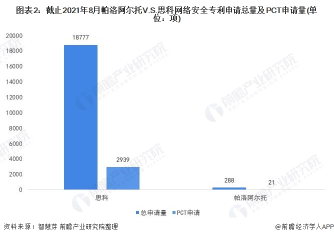 从专利申请量和PCT申请量来看,思科网络安全专利申请总量和PCT申请量均遥遥领先于帕洛阿尔托网络公司。截至2021年8月28日,思科网络安全专利申请总量为13018项,帕洛阿尔托为265项;思科网络安全专利PCT申请量为227项,帕洛阿尔托为7项。