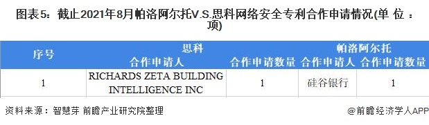 在专利合作申请方面,思科和帕洛阿尔托与其它人合作申请网络安全专利数量均为1项。