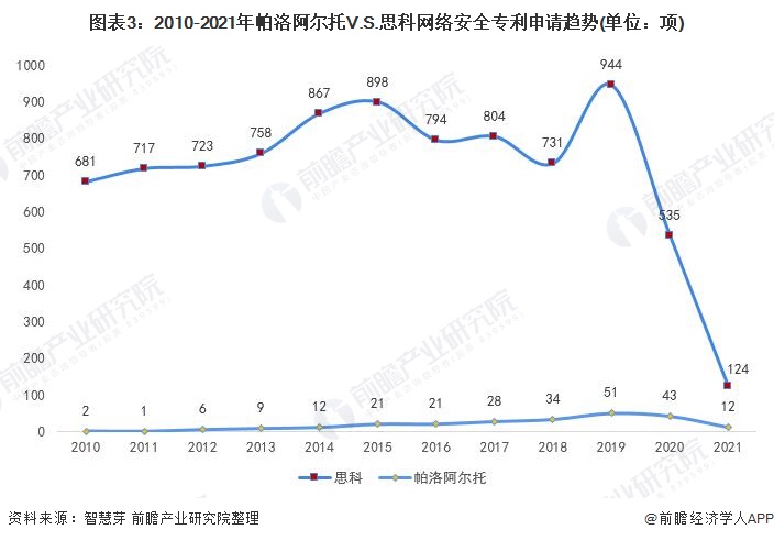 从趋势上看,2010-2021年8月,思科在网络安全领域专利申请数量每年均比帕洛阿尔托多,2020年,思科网络安全相关专利申请量为535项,帕洛阿尔托为42项。