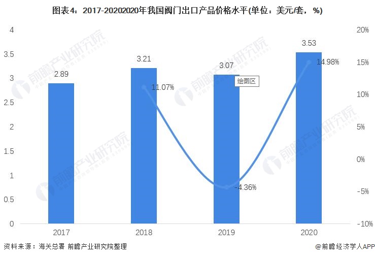 但如果把时间线拉长,2017-2020年,我国阀门制造业出口商品均价由2017年的2.89美元/套上涨到了2020年的3.53美元/套,涨幅达到了10.73%。