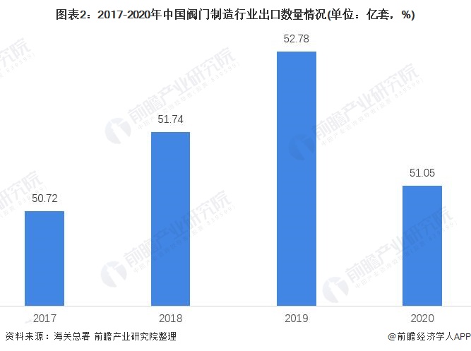 从出口数量来看,2017年来,我国阀门出口数量基本保持不变,2020年全年出口51.05亿套,同比下降3.27%。