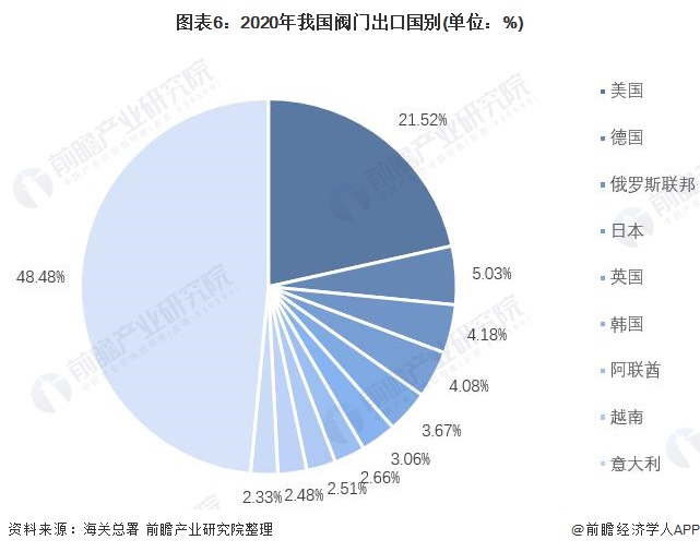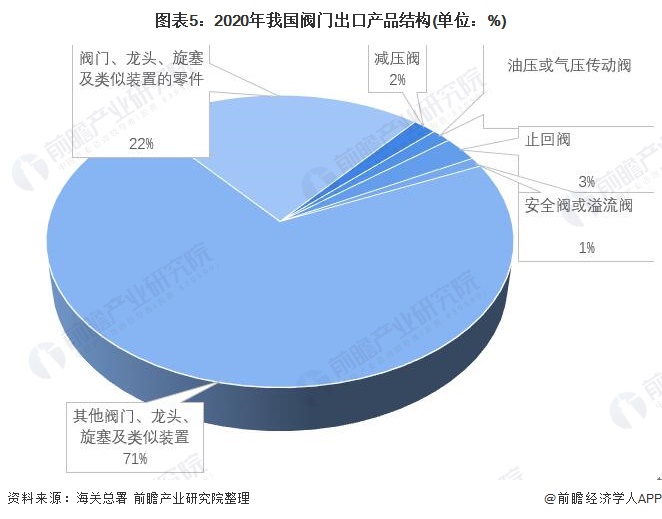 根据我国海关总署的数据,在2020年我国阀门出口的6种类别中,金额最多的是“其他阀门、龙头、旋塞及类似装置的零件”,总计出口113.18亿元,占阀门总出口金额的71%。其次为油压或气压传动阀,共计出口35.74亿美元,占比22%。