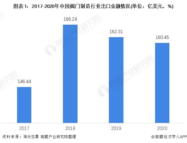 据海关数据显示,2017-2020年我国阀门制造行业出口金额呈总体呈现先升后降的趋势,2018年为166.24亿美元,同比增长13.5%;2019、2020年,我阀门制造行业出口总额有所回落,分别为162.31亿美元与160.45亿美元,分别同比下滑3.93和1.86个百分点。