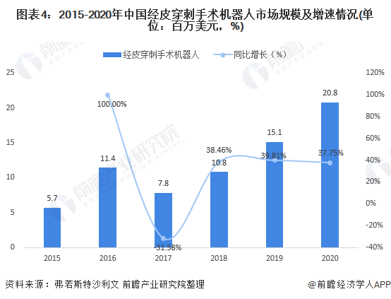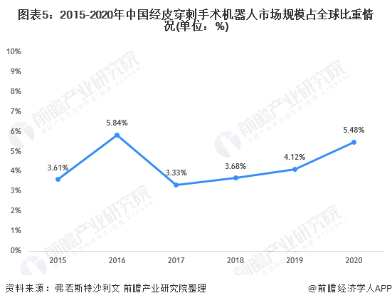 从中国经皮穿刺手术机器人市场占全球比重情况来看,2015-2020年占比在6%以下,整体占比不高,说明该行业仍处于发展初期。2017-2020年,中国经皮穿刺手术机器人市场规模占全球比重呈逐年上升趋势,说明中国经皮穿刺手术机器人市场逐渐发展。2020年全球经皮穿刺手术机器人市场规模为3.8亿美元,其中中国市场占比5.48%。