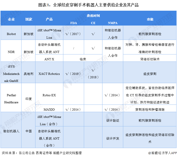 经皮穿刺手术机器人是通过MRI、超声、CT等成像技术将目标解剖定位,引导反馈针头达到目标解剖结构,辅助完成经皮穿刺手术的机器人。目前全球经皮穿刺手术机器人主要有Biobot的iSR’obot™ Mona Lisa、NDR的ANT系列、ISYS的XACT和Perfint Healthcare的两款产品(国内已上市)。国内龙头微创机器人通过合作引进两款产品。