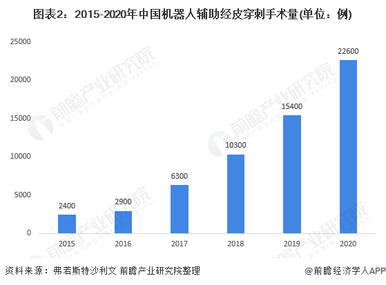 作为常用的诊断及治疗程序,经皮穿刺手术在全球流行,近年来中国市场也不断增长。机器人辅助技术不断进步,促使中国机器人辅助经皮穿刺手术数量由2015年的2400例增长至2020年的22600例,年均复合增长率超过56%,增长速度较快。