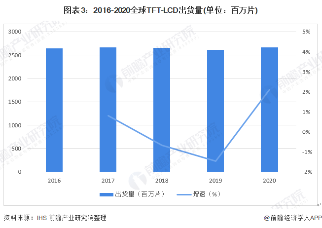 近年来,随着手机、电脑、液晶电视等市场的增长,以及新型应用市场如穿戴式产品、智能家居等快速发展,全球TFT-LCD面板需求也相应增长,2020年全球TFT-LCD出货量达到2666百万片。