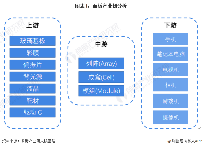 从产业链来看,面板产业可以分为上游基础材料、中游面板制造以及下游终端产品。其中,上游基础材料包括:玻璃基板、彩膜、偏振片、液晶、靶材等;中游面板制造包括:列阵(Array)、成盒(Cell)、模组(Module);下游终端产品包括:电视、电脑、手机和其他消费类电子。
