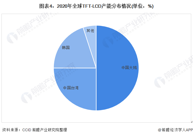 近年来,随着以京东方和华星光电为首的中国大陆面板厂商增加TFT-LCD产能,同时加快进军高世代生产线,带动了中国大陆TFT-LCD产能的持续增长。根据CCID数据,2020年,中国大陆约占全球TFT-LCD产能的50%,其次是中国台湾,占比约为25%;韩国占比约为20%。