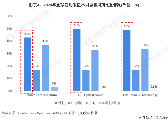 如今多个数据表明,隐形眼镜的周期分类中,日抛是增幅最快的短周期型产品,且短周期镜片保持主导地位。在《Contact Lens Spectrum》报告的抽样调查中发现,有57%的受访者人表示日抛类是他们更期待使用的软性镜片 (2020年为43%)。除了《Contact Lens Spectrum》读者概况调查外,还从ABB和GfK收集了关于佩戴时间的市场调查。在比较三个数据时,日抛款占主导地位的趋势变得明显:在这来源不同的三歌数据中,按软性镜片佩戴时间不同分类,日抛方式占首位(范围为43%- 50%),其次是月抛(范围为33%-37%)。