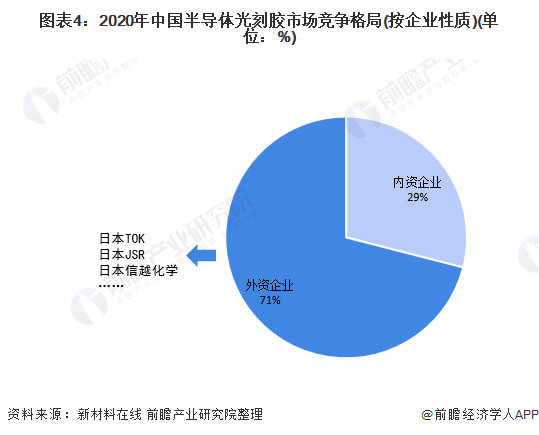 半导体光刻胶属于光刻胶高端产品,受技术限制,当前,我国半导体光刻胶需求主要由外资企业来满足,2020年,外资企业的市场份额达71%。