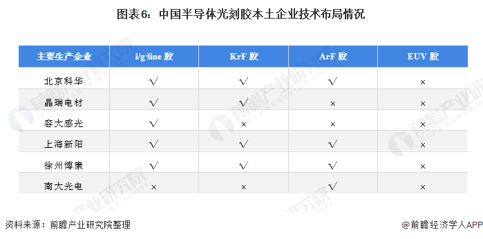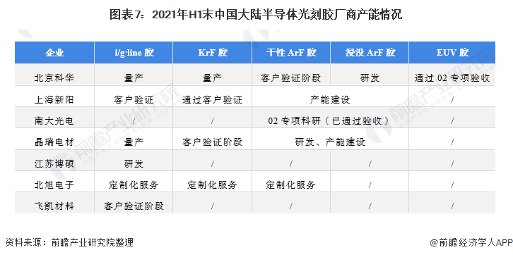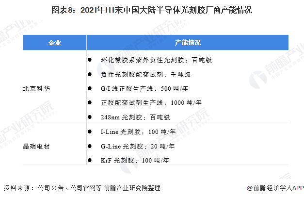 从本土企业的产能情况来看,截至2021年上半年末,可量产i/g line胶的企业包括北京科华、晶瑞电材;可量产KrF的企业有北京科华;而其余产品目前基本无可量产的企业: