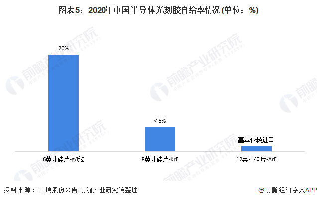 从不同光刻胶产品的自给率来看,目前适用于6英寸硅片的g线、i线光刻胶的自给率约为20%,适用于8英寸硅片的KrF光刻胶的自给率不足5%,而适用于12寸硅片的ArF光刻胶基本依靠进口,光刻胶国产化任重道远。