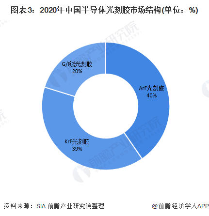 从我国半导体光刻胶的市场结构来看,2020年,ArF光刻胶占比40%;KrF光刻胶占比39%;G/I线光刻胶占比20%。
