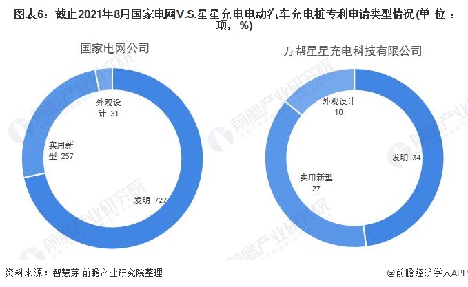 国家电网和星星充电的电动汽车充电桩专利申请类型均是发明专利最多。国家电网电动汽车充电桩发明专利申请量有727项,电动汽车充电桩实用新型和外观设计专利申请量分别为257项和31项;星星充电电动汽车充电桩发明专利和实用新型专利均占比较大,分别为34项和27项,电动汽车充电桩外观设计专利申请量仅10项。