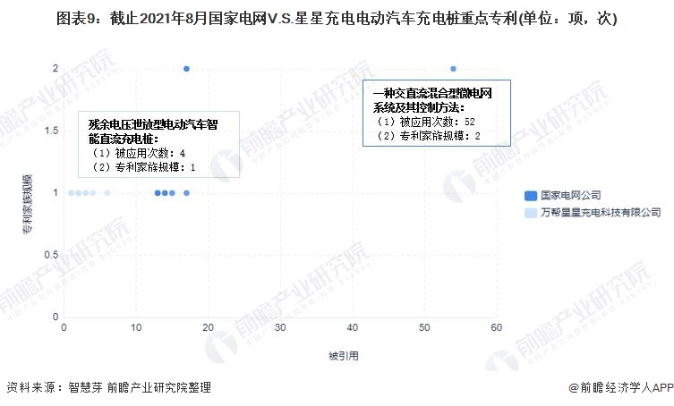 在重点专利布局上,国家电网重点布局的专利为“一种交直流混合型微电网系统及其控制方法”,该项专利被引用次数52次,专利家族规模为2项。星星充电重点布局的专利为“残余电压泄放型电动汽车智能直流充电桩”,该项专利被引用次数4次,专利家族规模为1项。整体来看,国家电网重点布局的专利无论是在专利被引用次数还是专利家族规模均较星星充电多。