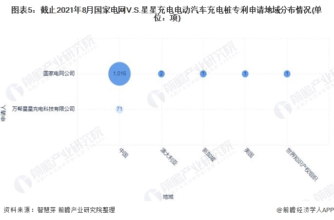 目前,国家电网和星星充电的电动汽车充电桩专利申请区域主要集中在中国,两者在中国申请的电动汽车充电桩专利数量分别为1016项和71项。