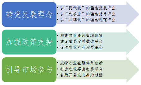 首先,转变区域农业的发展理念,主要涉及以“现代化”的理念发展农业、以“大农业”的理念指导农业和以“品牌化”的理念规范农业等三个方面。以“以‘品牌化’的理念规范农业”为例,市场经济的发展,让“品牌”这一标识化的形象逐渐引入消费者的脑海,品牌的价值也成为商品之间独特的竞争优势。在农业领域,农产品的品牌化建设一直处于一个缓慢发展的处境,一方面是受行业主体——农户的经营理念影响;另一方面缺乏一个规范的政府指导。因此,以“品牌化”的理念规范农业,首先需要解决的一个问题就是将“品牌化”这样一个具有现代市场经济特征的标识引入农产品销售过程中,建立具有地方特色的区域统一品牌,采用“区域品牌+产品品牌”双品牌的模式,在增加农产品辨识度的同时,提升其附加值。