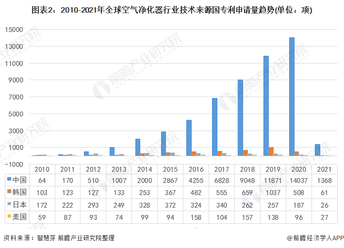 从趋势上看,2010-2021年,中国空气净化器专利申请数量遥遥领先。2020年,中国空气净化器专利申请量为14037项,远远高于第二名的韩国。