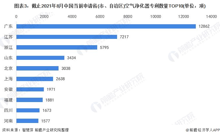 中国方面,广东为中国当前申请空气净化器专利数量最多的省份,累计当前空气净化器专利申请数量高达12862项。江苏、浙江、山东当前申请空气净化器专利数量分别排名第2-4名。中国当前申请省(市、自治区)空气净化器专利数量排名前十的省市还有北京、上海、安徽、福建、四川和河南。