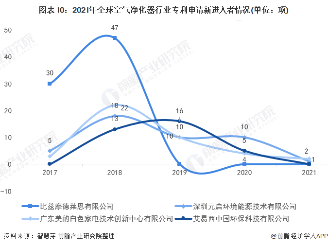 全球新进入者有四位,分别是比兹摩德莱恩有限公司、深圳元启环境能源技术有限公司、广东美的白色家电技术创新中心有限公司和艾易西中国环保科技有限公司,并且这四大新进入者在2018年申请空气净化器专利较为活跃。2020年新进入者中总申请量排名第一的比兹摩德莱恩有限公司申请量为0,而排名第四的艾易西中国环保科技有限公司申请了5项。