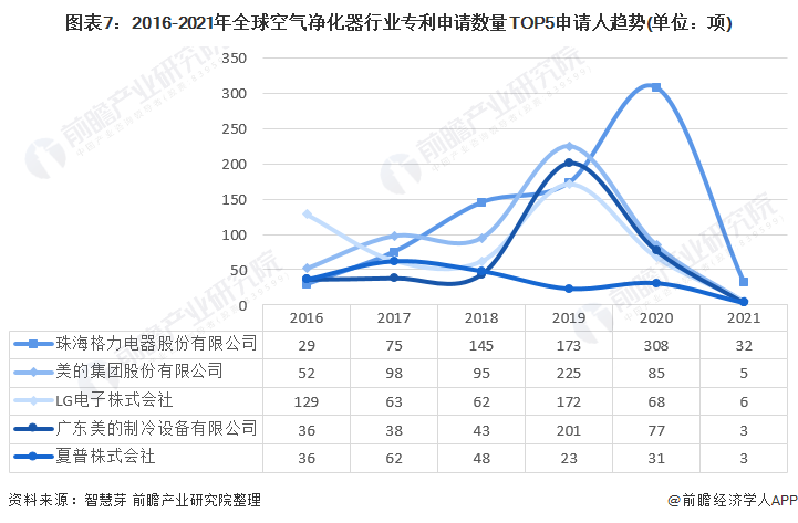 趋势方面,2016-2019年,全球前五大空气净化器专利申请人申请的专利数差距不大,2020年排名第一的珠海格力电器有限公司的专利数量远多于排名第二的美的集团股份有限公司。