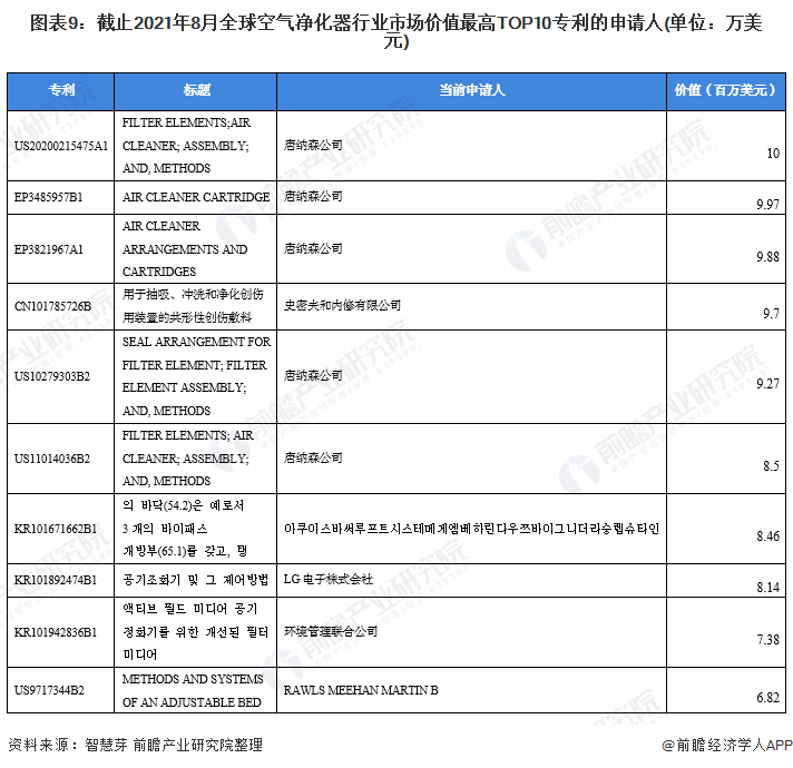 全球空气净化器市场价值最高TOP10专利中,有5席由唐纳森公司占据,并且唐纳森公司拥有三项全球空气净化器市场价值最高的专利,价值均接近1000万美元。
