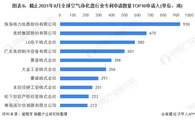 其中,珠海格力电器股份有限公司空气净化器专利申请数量最多,为930项。美的集团股份有限公司排名第二,其空气净化器专利申请数量为670项。