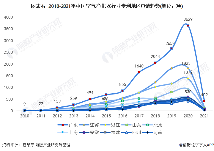 趋势方面,2010-2020年期间,广东空气净化器专利申请量始终位居榜首,且2016年起差距逐渐拉大。北京、上海、安徽和福建在2020年的空气净化器专利申请量差距不大。