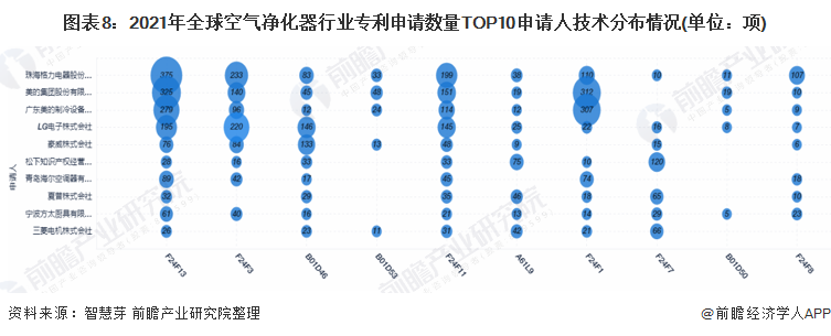 目前,全球空气净化器行业专利申请数量TOP10申请人技术主要布局在F24F13细分领域,其中全球空气净化器专利申请量第一的珠海格力电气股份有限公司在该细分领域专利申请量达到37项。